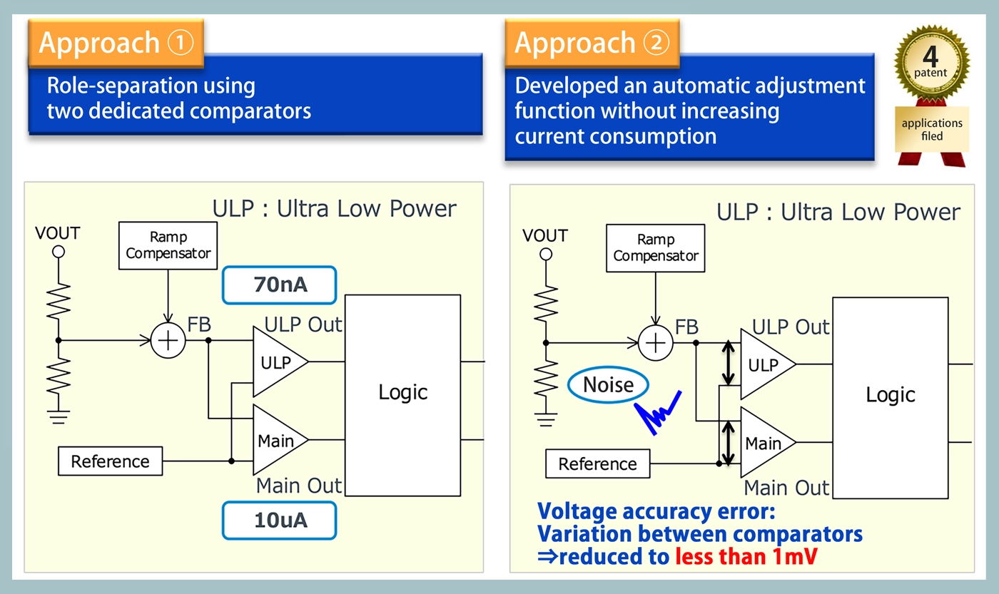 'But we took a completely different approach--using two comparators, one dedicated to high-speed response and the other to ultra-low power consumption, switching between them as needed. On top of that, we developed a proprietary technology to automatically compensate for any variations between the two.'