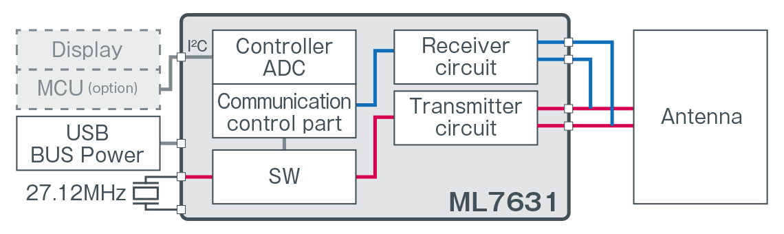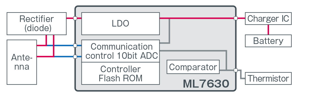 The 13.56 MHz(NFC) wireless charging LSI,"ML7630/7631",uses the magnetic field resonance method to supply power through 13.56 MHz magnetic fields.