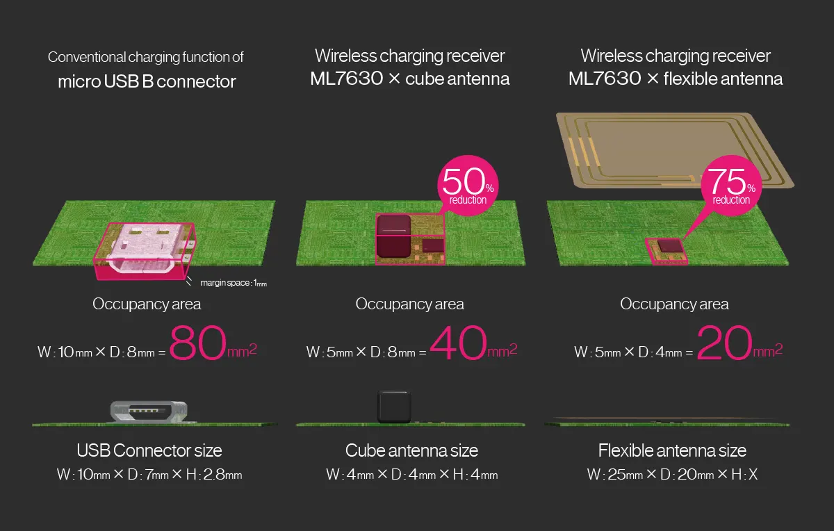 When compared to other charging systems, the 13.56 MHz(NFC) wireless charging that can use ultra-compact antennas offers more "compact implementation".