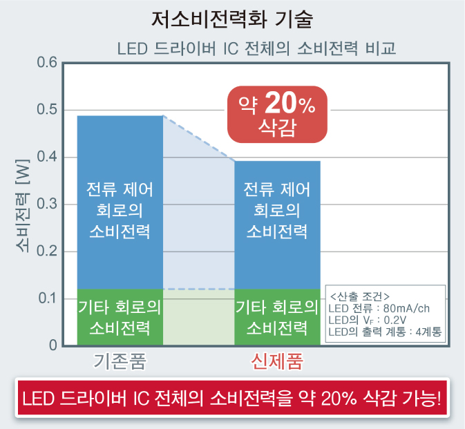 로옴 주식회사 (본사 : 교토)는 카 인포테인먼트 및 차량용 미터 클러스터용 등으로, 자동차의 중형 디스플레이용 4ch LED 드라이버 IC 「BD83A04EFV-M」, 「BD83A14EFV-M」과 대형 디스플레이용 6ch LED 드라이버 IC 「BD82A26MUF-M」을 개발하였습니다. 신제품은 독자적인 저소비전력화 기술을 통해 LED 드라이버의 전류 제어 회로에서의 손실을 저감하였습니다. 이에 따라, 일반적인 사양 조건 (LED 회로전류 : 80mA/ch, 전원전압 : 12V)에서 비교 시, IC 전체의 소비전력을 기존품 대비 약 20% 삭감 가능하므로 소비전력이 특히 중요시되는 중대형 디스플레이를 탑재하는 차량용 어플리케이션의 저소비전력화에 기여합니다. 또한, 신제품 모두 DC 조광※1과 PWM 조광※2의 2종류를 탑재하여, 폭넓은 사양에 대응 가능합니다. PWM 조광으로는, 저휘도에서 고휘도까지 전류 피드백 모드 전환이 필요하지 않은 로옴의 독자적인 Seamless PWM 조광을 채용하였습니다. 일반적인 PWM 조광에서 플리커 현상 발생의 원인이 되는, 저휘도와 고휘도 시의 전류 피드백 모드 전환이 필요하지 않아 플리커 현상의 발생 리스크를 저감할 수 있기 때문에 어플리케이션의 신뢰성 향상에 기여합니다.