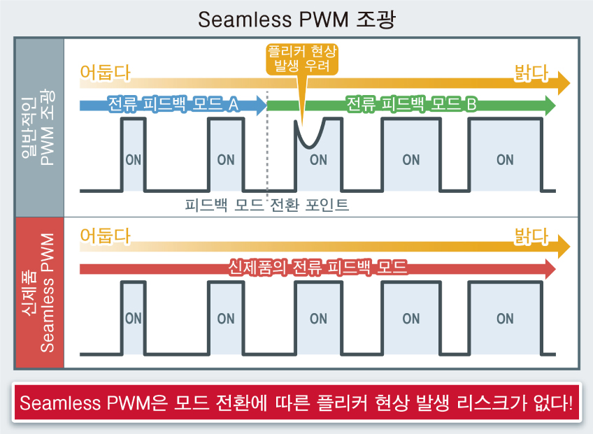 신제품은 모든 기종이 PWM 조광과 DC 조광을 탑재하여, 폭넓은 사양에 대응 가능합니다. 또한, PWM 조광은 저휘도에서 고휘도까지 플리커 현상이 발생하지 않고 매끄러운 조광이 가능한 Seamless PWM 조광을 채용하고 있습니다.
