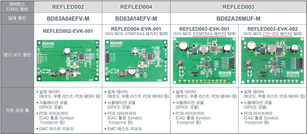 신제품을 탑재한 레퍼런스 디자인 4종류 (REFLED002, REFLED004, REFLED003)를 로옴 홈페이지에서 공개하고 있습니다 (하기 표 참조). 차량용 디스플레이의 LCD 백라이트 점등 회로 검토에 최적이며, 표준적인 전기적 특성 측정과 더불어, EMC 테스트, 열 특성 시험도 실시 완료하였습니다. 또한, 평가 리포트와 동시에 설계 데이터 및 탑재 제품의 SPICE 모델, PCB CAD용 Symbol 등 각종 툴도 공개하여, 레퍼런스 보드를 사용함으로써 실제 기기에서의 검토도 용이해집니다.