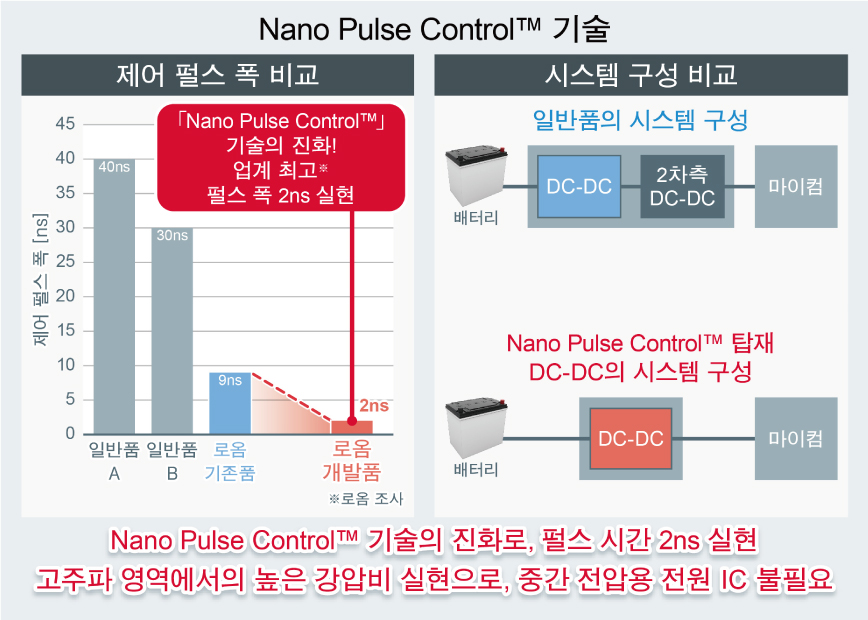 나노초 (ns)의 스위칭 ON 시간 (전원 IC의 제어 펄스 폭) 실현으로, 기존에는 불가능했던 고전압에서 저전압으로의 변환을 가능하게 하는 초고속 펄스 제어 기술입니다.