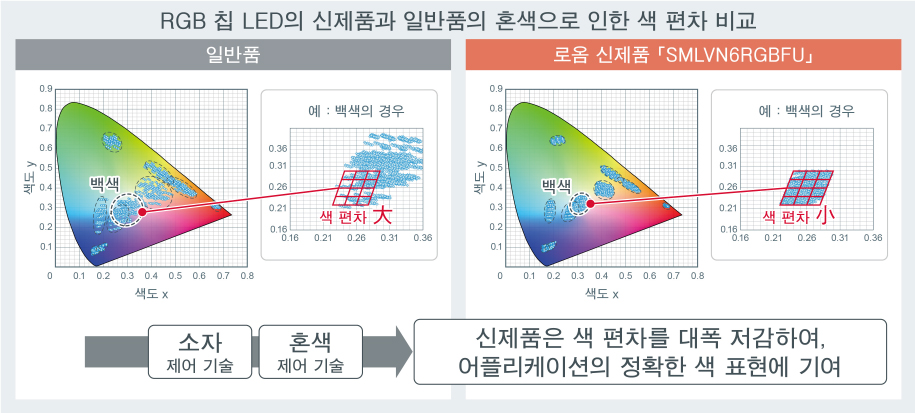 이러한 상황에서, 로옴은 자체 제작 소자 기술을 통해 RGB 소자의 발광 특성을 세밀하게 제어하고, 혼색성을 높임으로써, 색 편차를 저감한 RGB 칩 LED를 개발하였습니다.