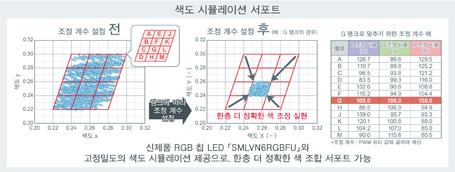 SMLVN6RGBFU는 색도 랭크에 따라 조정 계수를 설정하여, 한층 더 원하는 색에 가깝게 조정할 수 있도록 서포트하고 있습니다. 신제품 RGB 칩 LED와 고정밀도 색도 시뮬레이션을 함께 제공함으로써 한층 더 세밀한 색상 조정이 가능합니다.