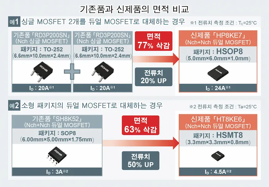 신제품은 로옴의 최신 프로세스와 이면 방열 패키지를 채용함으로써, 업계 최고의 낮은 ON 저항 (Ron)※3을 달성하였습니다 (Nch+Nch의 경우, HSOP8로 19.6mΩ, HSMT8로 57.0mΩ). 일반적인 듀얼 MOSFET에 비해 ON 저항을 최대 56% 저감하여, 기기의 저소비전력화에 크게 기여합니다. 또한, 2개의 칩을 1개의 패키지에 탑재함으로써 면적을 삭감할 수 있어, 기기의 스페이스 절약화에 기여합니다. 예를 들어, HSOP8의 경우, 1칩 내장의 싱글 MOSFET (TO-252) 2개를 대체하여 사용할 수 있으므로, 면적을 77% 삭감할 수 있습니다.