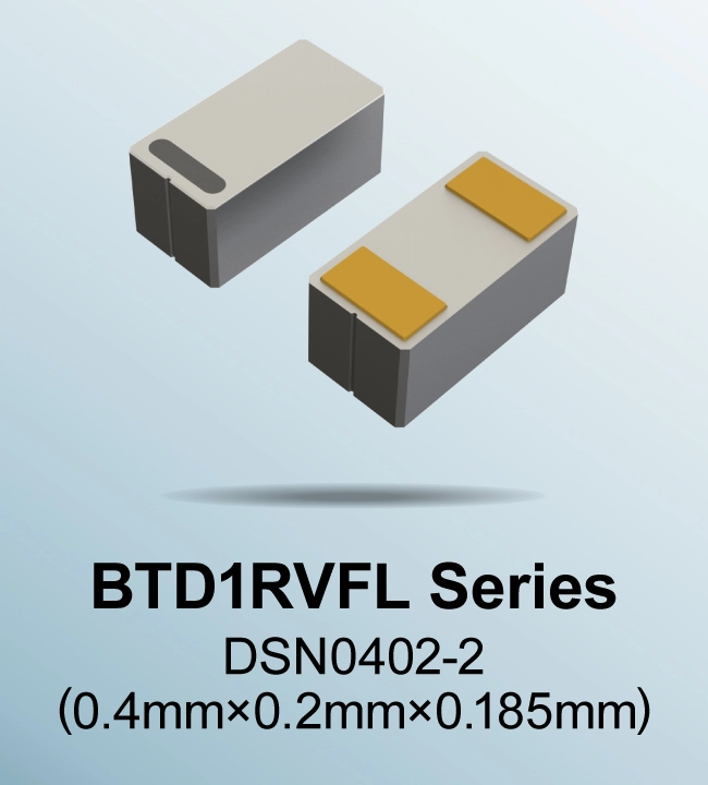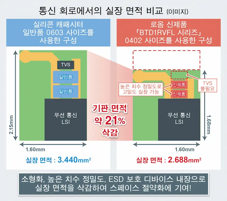 첫번째 제품인 「BTD1RVFL 시리즈」는 면실장 타입의 양산품 실리콘 캐패시터로는 업계 최소※인 0402 (0.4mm×0.2mm) 사이즈를 실현하였습니다. 일반품 0603 사이즈 대비 실장 면적은 약 55% 줄어든 0.08mm2이므로, 어플리케이션의 소형화에 기여합니다. 또한, TVS 보호 소자를 내장하여 높은 ESD※2 내성을 확보함으로써, 서지 대책 등 회로 설계 공수를 삭감할 수 있습니다.