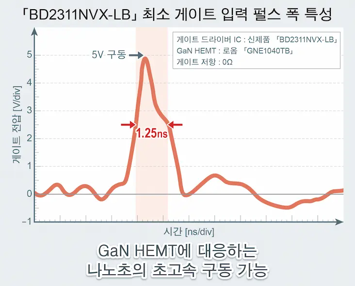 신제품은 나노초 (ns)의 게이트 구동 속도를 실현하여, GaN 디바이스를 고속으로 스위칭시킬 수 있습니다. 이러한 특성은 GaN 디바이스에 대한 충분한 이해를 바탕으로 게이트 드라이버 IC의 성능 향상을 추구함으로써 실현할 수 있었습니다. 최소 게이트 입력 펄스 폭 1.25ns의 고속 스위칭을 통해 어플리케이션의 소형화, 저전력화, 고성능화에 기여합니다.