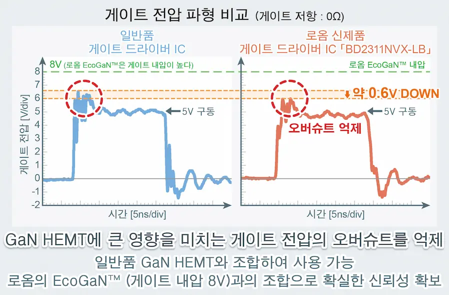또한, 독자적인 구동 방식을 채용함으로써, 기존에는 실현이 어려웠던 게이트 입력 파형의 오버슈트※1를 억제하는 기능도 탑재하여, 과전압 입력으로 인한 GaN 디바이스의 고장을 방지합니다. 로옴의 EcoGaN™과 함께 구성하면, 세트 설계가 용이해짐과 동시에 어플리케이션의 신뢰성 향상에도 기여합니다. 그리고, 어플리케이션의 다양한 요구에 대해서도 게이트 저항을 조정함으로써, 최적의 GaN 디바이스를 선정할 수 있습니다.