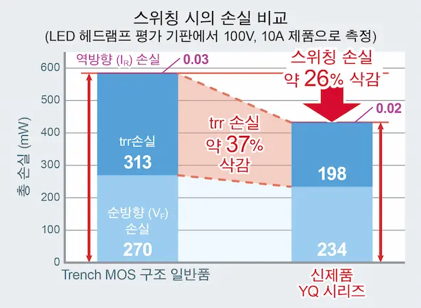 그러나 일반적인 Trench MOS 구조의 경우, 기생 용량 (디바이스 속 저항 성분)이 커지게 되어 Planar 구조에 비해 trr이 악화됩니다. 「YQ 시리즈」는 VF와 IR을 개선함과 동시에, 독자적인 구조 설계를 통해 업계 최고 수준의 trr (15ns)을 달성하였습니다. 스위칭 시의 손실을 약 26% 저감할 수 있으므로 어플리케이션의 저소비전력화에 기여합니다.