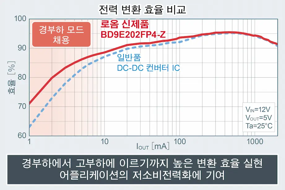 「BD9E105FP4-Z / BD9E202FP4-Z / BD9E304FP4-LBZ」는 경부하 모드 시 COT 제어 방식※1을 채용함으로써 일반품 대비 경부하 시의 효율이 개선되어 대기전력을 억제하고자 하는 어플리케이션에 최적입니다.