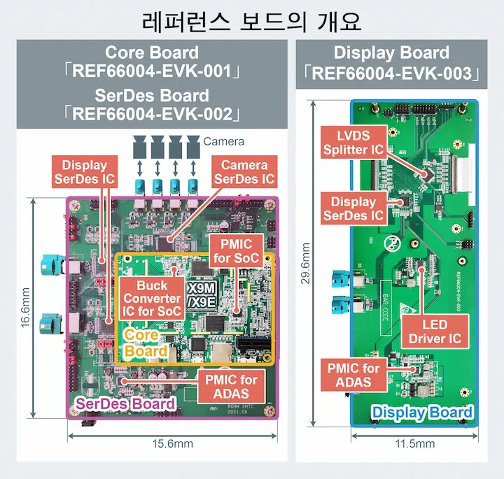 로옴 주식회사 (본사 : 교토)는 스마트 콕핏용 SoC※1 메이커로서 중국의 유명 기업인 Nanjing SemiDrive Technology Ltd. (이하, SemiDrive)와 스마트 콕핏용 레퍼런스 디자인 「REF66004」를 공동 개발하였습니다. 본 레퍼런스 디자인은 SemiDrive의 차량용 SoC 「X9M」 및 「X9E」를 중심으로 구성되었으며, 로옴의 PMIC※2 및 SerDes IC※3, LED 드라이버 IC 등이 탑재되었습니다. 또한, 레퍼런스 디자인을 베이스로 하는 레퍼런스 보드 「REF66004-EVK-00x」도 구비하였으며 Core Board, SerDes Board, Display Board로 구성되어 있습니다. 레퍼런스 보드에 대해서는 담당 영업 또는 로옴 Web 문의 창구를 통해 문의하여 주십시오.