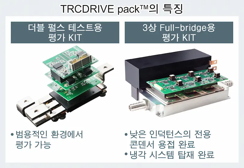 TRCDRIVE pack™은 2024년 내에 패키지 사이즈 (Small / Large)와 실장 패턴 (TIM : heat dissipation sheet / Ag Sinter)에 따라 12개 제품을 구비하여 전개할 예정입니다. 또한, 모듈에 히트싱크를 탑재한 6in1 제품도 개발중으로, 설계 사양에 따른 신속한 트랙션 인버터 설계 및 모델 전개에 기여하고 있습니다.