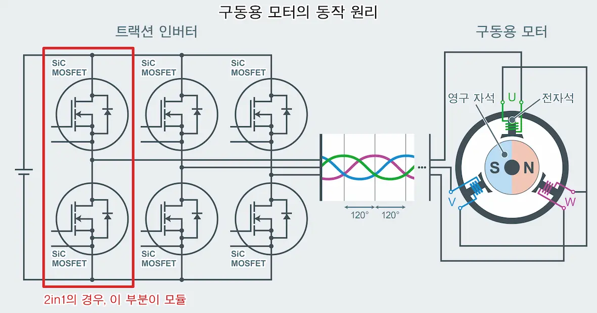 - 직류를 3상 교류로 변환하기 위해서는, 스위칭을 실행하기 위해 1상당 High-side와 Low-side의 MOSFET가 1개씩 필요하다. 이러한 2개의 MOSFET를 1개의 모듈에 탑재한 것이 2in1 구성이다.