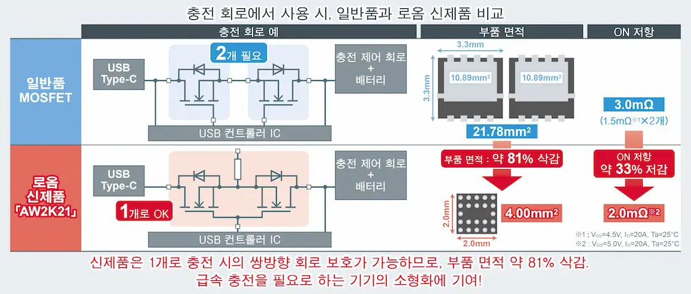 로옴은 이러한 과제를 해결하기 위해, 대전력 급속 충전에 대응 가능한 낮은 ON 저항의 초소형 MOSFET 「AW2K21」을 개발하였습니다.