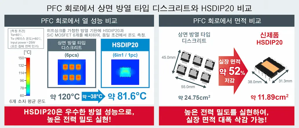 HSDIP20은 높은 방열 성능의 절연 기판을 내장하여, 대전력 동작 시에도 칩 온도 상승을 억제할 수 있습니다. 실제로 OBC에서 일반적으로 채용되는 PFC 회로 (SiC MOSFET 6개 사용)에서 상면 방열 타입의 디스크리트 6개와 6in1 구성의 HSDIP20 1개를 동일 조건으로 비교하면, HSDIP20의 온도가 약 38℃ 낮은 것을 확인할 수 있습니다 (25W 동작 시). 또한, 높은 방열 성능을 통해 소형 패키지로 대전류 대응을 실현할 수 있습니다. 상면 방열 타입의 디스크리트에 비해 3배 이상, 동일한 DIP 타입 모듈에 비해 1.4배 이상에 해당하는 업계 최고 수준※의 전력 밀도를 달성하였습니다. 이에 따라, 앞서 기술한 PFC 회로에서 HSDIP20은 상면 방열 타입 디스크리트보다 실장 면적을 약 52% 삭감할 수 있으므로, OBC 등에서 전력 변환 회로의 소형화에 크게 기여합니다.