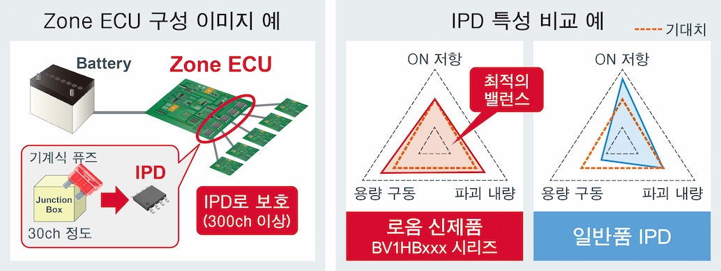 자동 운전 및 전기자동차 (EV)의 진화에 따라, 자동차의 전자 제어는 나날이 고도화되고 있습니다. 이에 따라, 기능 안전의 관점에서 전자적 보호의 중요성이 높아져, 자동차를 Zone 단위로 관리하는 「Zone ECU화」가 추진되고 있습니다. 이러한 상황에서 전자적으로 부하를 보호하고 제어하는 IPD의 채용이 가속화되고 있습니다. Zone ECU는 다수의 부하를 일괄하여 제어하기 때문에 기존의 IPD로는 용량 부하의 구동 능력이 부족한 실정이었습니다. 로옴이 새롭게 개발한 IPD는 낮은 ON 저항과 높은 에너지 내량이라는 기본적인 성능을 만족함과 동시에, 기존에는 부족했던 용량 구동 능력을 향상시켰습니다. Zone ECU의 요구에 대응하는 고성능 IPD를 제품화함으로써, 기계식 퓨즈를 사용하지 않는 「자동차의 전자화」를 강력하게 추진하고 있습니다.