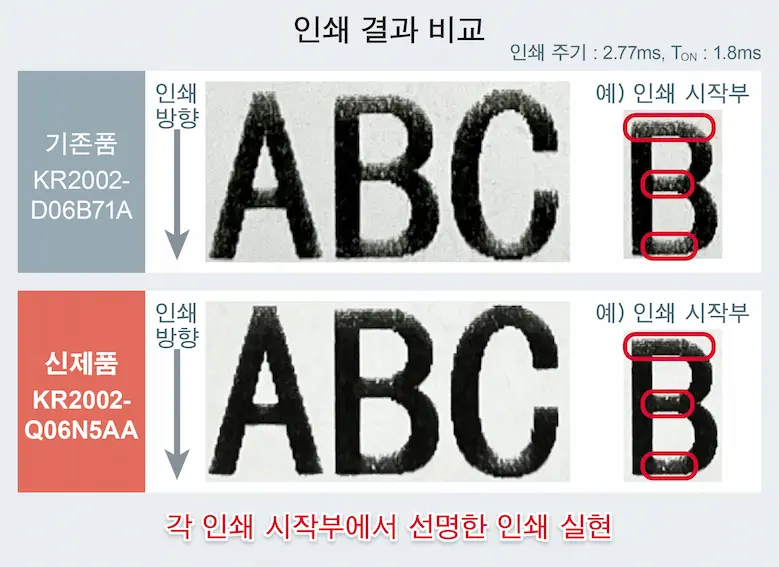 이러한 개선을 통해 리튬이온 배터리 2셀 (7.2V) 구동 타입 기존품과 동등한 인쇄 속도와 인쇄 화질을, 리튬이온 배터리 1셀로 실현하였습니다. 또한, 1셀 구동 서멀 프린트 헤드의 기존품 대비, 인쇄에 필요한 인가 에너지를 약 30% 삭감하는데 성공하였습니다. 이에 따라, 서멀 프린터 기기의 소형 · 경량화와 저전력화에 기여합니다.