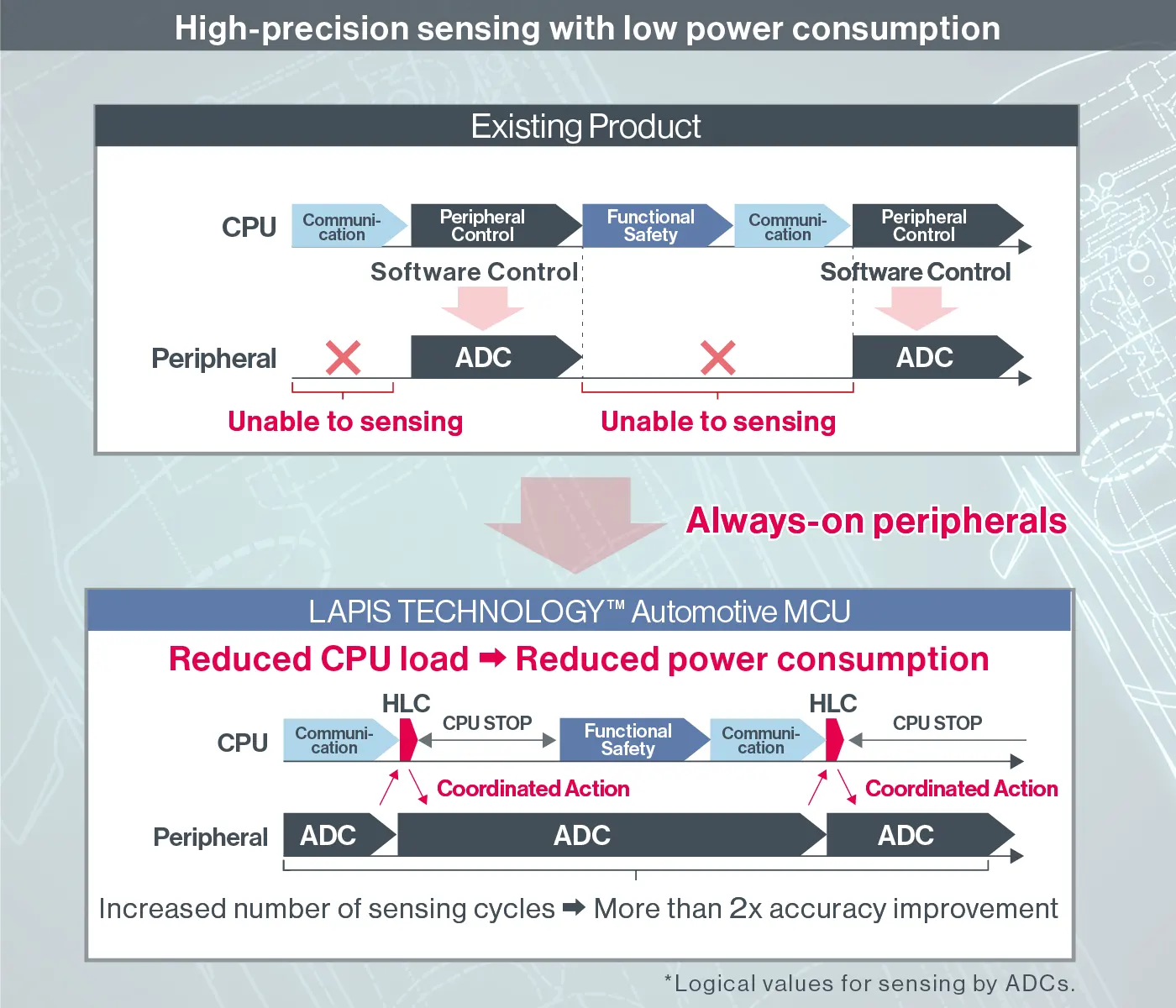 These MCUs are equipped with a unique sequencer HLC (Hardware Linkage Controller) that enables linked operation of peripherals without software control, enabling high-precision control and sensing, making it ideal for in-vehicle sensor/actuator control.