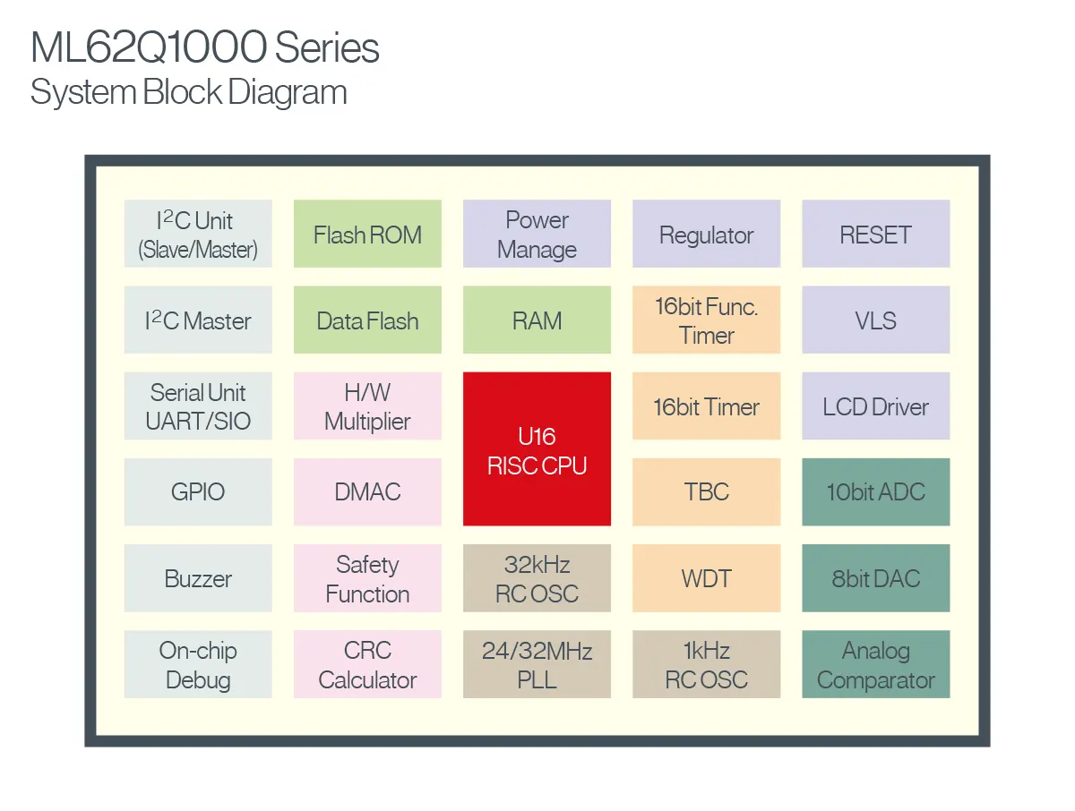 The ML62Q1000 series which is equipped with the original RISC 16bit CPU "U16 Core" is a general-purpose 16bit MCU.