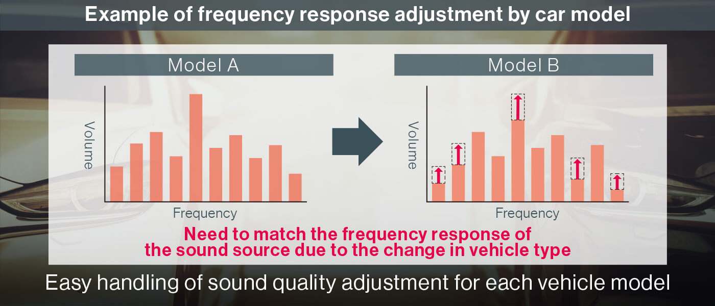 Pitch control (4 independent channels), volume control (4 independent channels), and frequency adjustment using a 5-band equalizer make it easy to adjust the vehicle approach warning sound without changing the sound source.