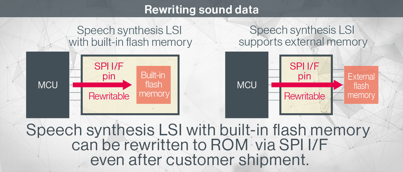 [Products with flash memory] and [products with external memory] can rewrite sound data via the SPI I/F of the microcontrollers.