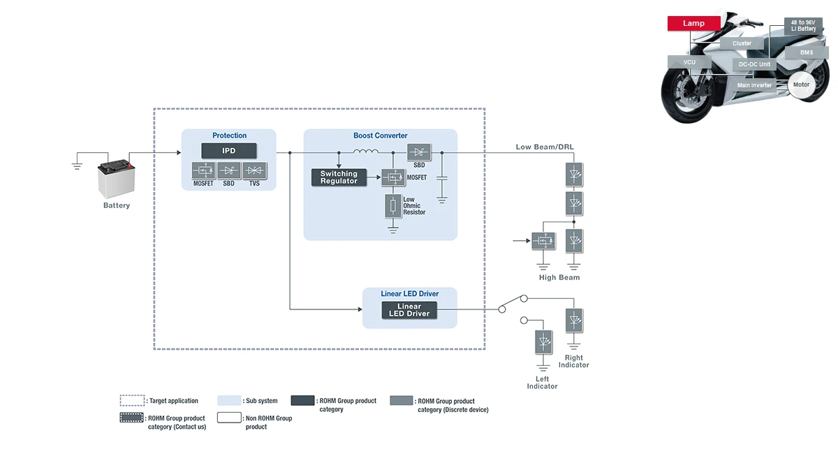이륜 바이크에는 단순한 점등뿐만 아니라 각국의 규제에 대응하는 광량 및 조사 범위 제어, 그리고 헤드라이트와 다른 램프와의 연계 제어가 요구되는 경우가 있습니다.