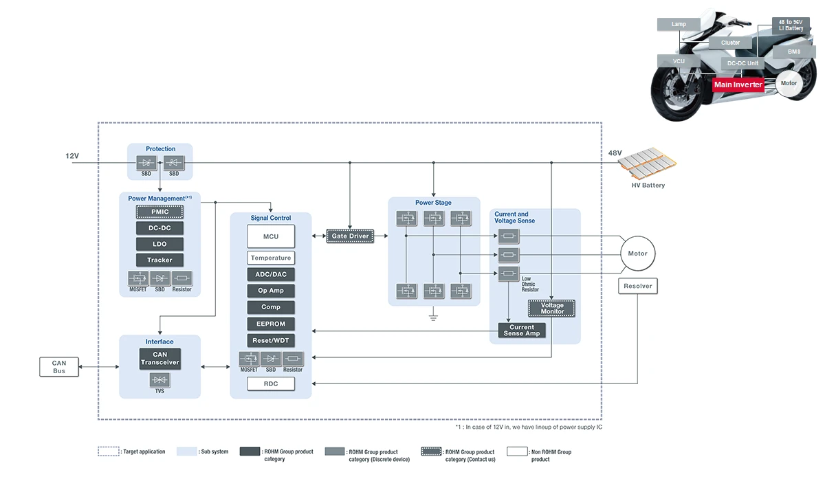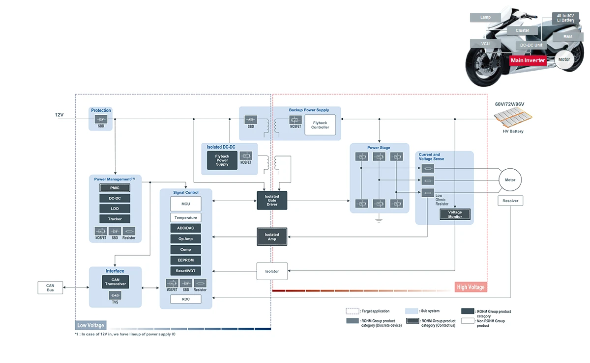로옴은 Si MOSFET 및 절연 대응 구동 IC, 제어 IC, 전원 IC, 션트 저항기 등 폭넓은 제품을 제공하여 유닛의 소형화와 전동 바이크의 주행 거리 연장에 기여합니다.