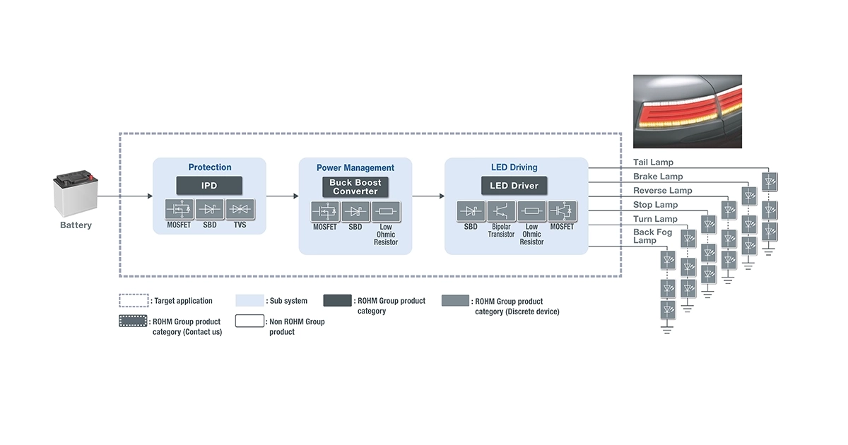 로옴은 기능 안전에 적합한 고기능 LED 드라이버 IC를 제공하여, 리어램프의 신뢰성 향상에 기여하고 있습니다.