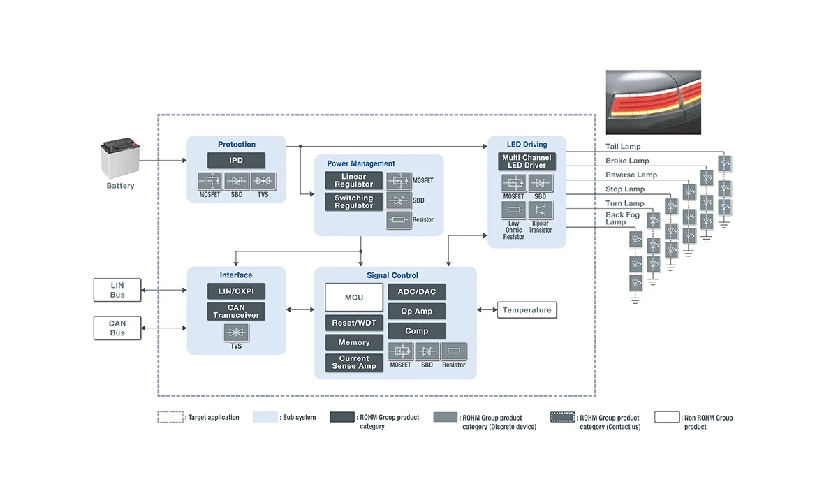 로옴은 기능 안전에 적합한 고기능 LED 드라이버 IC를 제공하여, 리어램프의 신뢰성 향상에 기여합니다.