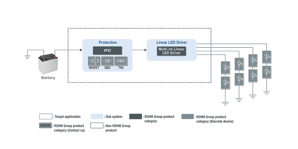 로옴은 리니어 방식의 LED 드라이버와 더불어, 색도 편차를 억제한 오토모티브 사양의 LED, 방열 · 보호 기능을 강화한 MOSFET 및 IPD 등의 주변부품을 전개하여, 고신뢰성 및 소형화를 실현하는 시스템 설계를 서포트하고 있습니다.