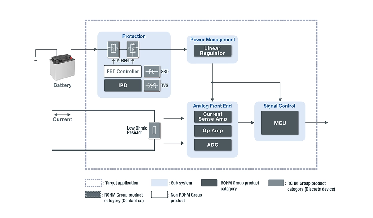 션트 저항의 양끝에서 발생하는 전압 강하를 측정하는 전류 센싱 방식에 대해, 로옴은 고방열 션트 저항기 및 고정밀도 전류 센스 앰프, 고정밀도 OP Amp를 통한 고정밀도 전류 센싱 솔루션을 제공하고 있습니다.