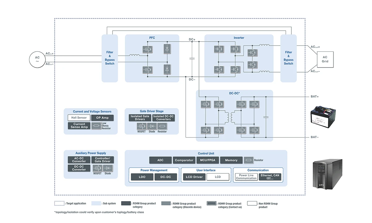 로옴은 소형 UPS에서 100kVA의 대형 UPS에 이르기까지 폭넓게 적용할 수 있는 풍부한 파워 반도체와 전원 회로 토폴로지를 제공함으로써 견고한 전원 시스템 구축에 기여합니다.