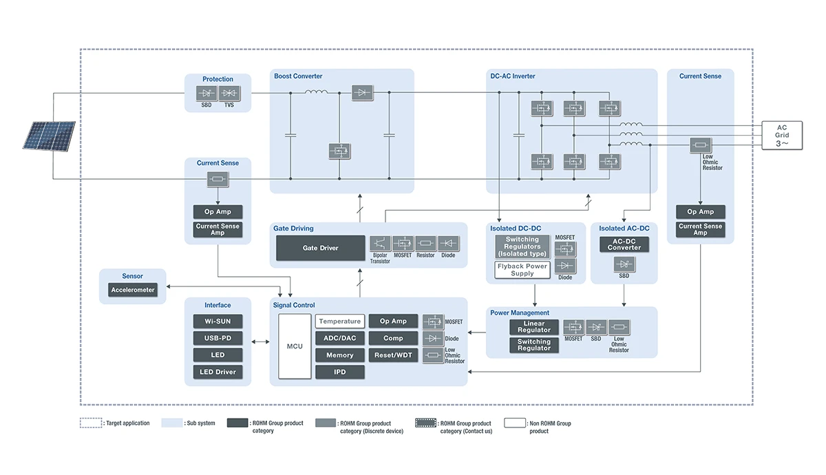 로옴은 태양광으로 발전된 전력을 고효율로 전력망에 전달하기 위해, 파워 반도체를 중심으로 하는 파워 솔루션을 제공하고 있습니다. 태양광으로 발전된 불안정한 DC 전압을 승압하고, DC-AC 인버터를 통해 원하는 전압과 주파수의 AC 전력으로 변환하는 구성에 있어서, 각각의 블록에 최적인 부품 라인업을 구비하여 시스템 전체의 특성 향상에 기여합니다.