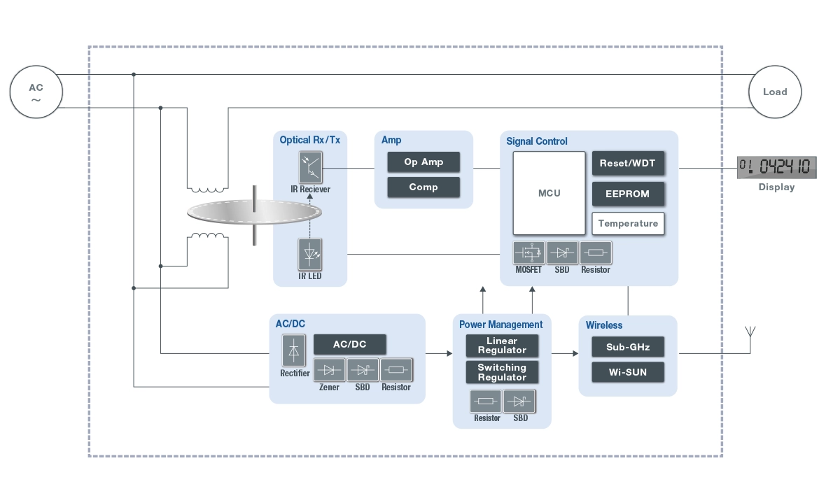 전력 수급이 불안정해지고 있는 오늘날, 스마트미터는 사용자나 전력회사가 효과적인 전력 관리를 실현할 수 있는 기기로서, 보안이나 통신 기능을 포함하여 장기간에 걸쳐 정확하게 전력 사용량을 계측할 수 있는 능력이 요구됩니다. 로옴은 고신뢰성 OP Amp 및 저소비전력 전원 IC, 그리고 무선 통신 디바이스를 통해 데이터 계측과 전력 효율의 최적화에 기여합니다.