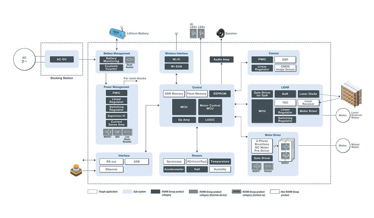 로옴은 고출력 레이저 다이오드와 GaN HEMT를 조합하여 LiDAR 장거리 대응 · 고정밀도화 솔루션을 제공하고 있습니다. 또한, 무선 통신 및 센서, 모터 구동용 제품을 제공하여 AGV의 자율주행 성능 향상과 IoT 연계 구축에 기여합니다.
