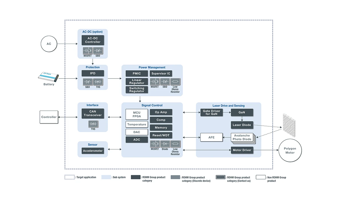 로옴은 고출력 레이저 다이오드와 GaN HEMT를 조합하여 LiDAR 장거리 대응 · 고정밀도화 솔루션을 제공하고 있습니다. 또한, 무선 통신 및 센서를 조합함으로써 산업기기의 IoT 기술 향상에 기여합니다.