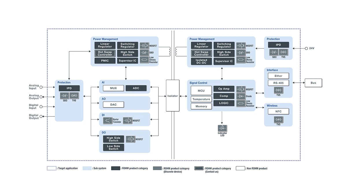 로옴은 PLC의 입출력 유닛에 최적인 고효율 전원 IC 및 보호회로를 내장한 IPD (Intelligent Power Device), 신호 처리에 필요한 각종 IC를 제공하여, PLC의 신뢰성 향상과 노이즈 내성 향상에 기여합니다.