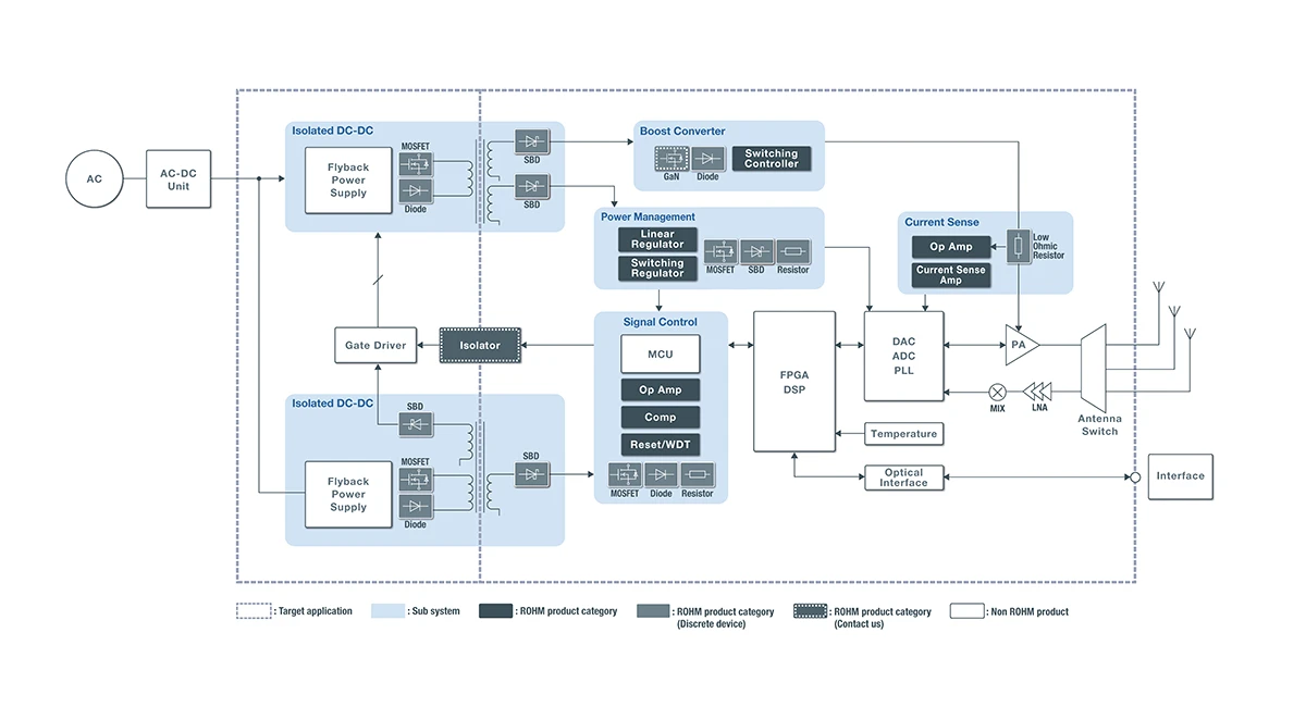 로옴은 파워 반도체와 더불어, 각 블록에서 사용 가능한 소형 · 고내압 반도체 소자 및 부품수 삭감이 가능한 고효율 전원 IC의 라인업을 구비하고 있으며, 기지국 장치의 저소비전력화뿐만 아니라 소형화에도 기여하는 솔루션을 제공하고 있습니다.