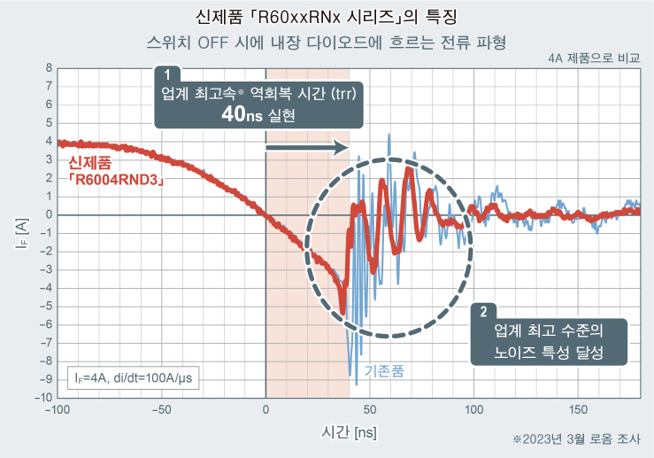 로옴의 PrestoMOS™ 시리즈는 로옴의 독자적인 특허 기술을 통해 기생 다이오드를 고속화함으로써, 중요 특성인 역회복 시간 (trr)에서 업계 최고 속도를 실현하였습니다. 그러나, 통상적으로 다이오드의 고속성으로 인해 급격한 전류 변화가 발생하여 발진이 커지는 경향이 있습니다.