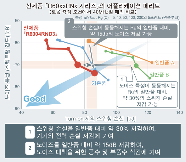 또한, 새롭게 개발한 독자적인 Super Junction 구조를 통해, 역회복 시간의 고속화와 트레이드 오프 관계인 노이즈 특성도 일반품 대비 약 15dB 저감하였습니다 (로옴 측정 조건에서 40MHz일 때의 비교). 기기의 노이즈 대책을 위한 공수 및 부품수 삭감에 기여합니다.